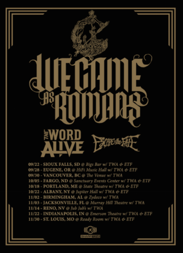 Fans of We Came As Romans may have caught the mysterious teaser the band released a couple of weeks ago, giving a small snipper of a preview into a future album. (If not, catch it streaming via the SharpTone Records Official YouTube channel here). More details on that record have yet to arrive, but what has been announced for these Michigan Metalcore musicians is a series of headline dates during an existing upcoming tour. We Came As Romans’ slot supporting I Prevail is set to kick off later this month and run through December, but there will be a handful of dates along the way where We Came As Romans will hold the headlining slot. The Word Alive and Escape the Fate will provide support on these special headline shows. Check out: https://www.facebook.com/wecameasromans/ for further details.