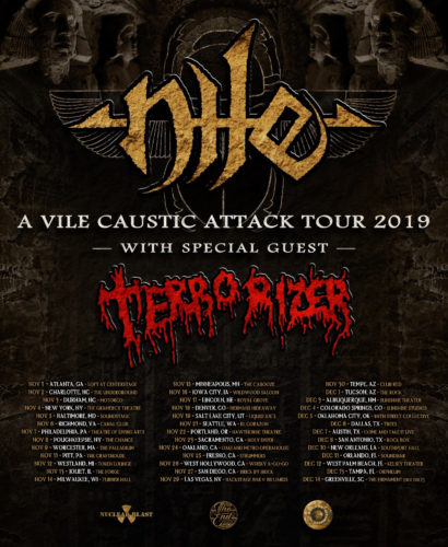 Nile has just declared their plans to “attack” the U.S. later this year, as they announce their 2019 A Vile Caustic Attack tour alongside special guest Terrorizer. While Terrorizer will tour in support of their recent release, Caustic Attack, Nile will be on the road during this fall run to support their record, What Should Not Be Unearthed, out on August 28th via Nuclear Blast. Nile recently revealed a lyric video for the first single, “Call To Destruction”, available via the Nuclear Blast Official YouTube Channel right here. A Vile Caustic Attack will hit the road on November 1st and run through December 14th, covering plenty of ground on all the coasts and everything in between. Keep an eye on: https://www.facebook.com/nilecatacombs/ for further details coming soon.