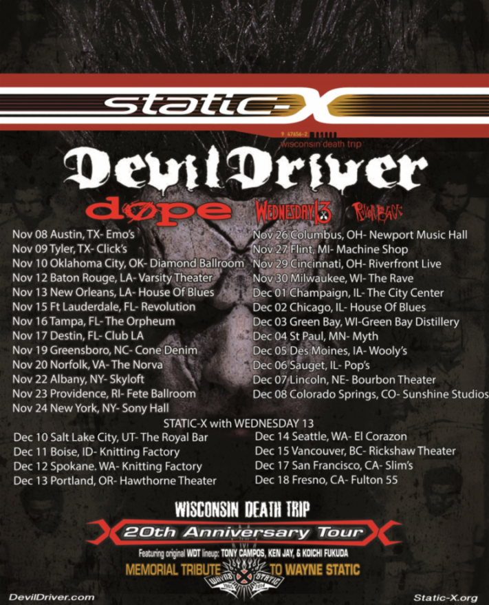 Tony Campos of Static-X says, “We are so honored and grateful to all the fans who came out and supported the Wisconsin Death Trip 20th Anniversary tour! The response was absolutely overwhelming! There were a number of places that were left out of the first leg, so we are very excited for the opportunity to circle back and celebrate all the good times we had with Wayne. We look forward to giving those fans an opportunity to pay their respects with us and to experience Wisconsin Death Trip once again before 2019 comes to a close. From the bottom of our hearts, thank you all!” While masked vocalist Xero adds, “The first leg of the tour was absolutely insane! Almost every single show was SOLD OUT! Thank you to everyone for being so supportive! We are very excited to be able to get out there and hit a bunch of cities that didn’t appear on the first leg”.